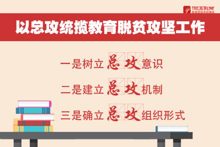 三是确立总攻组织形式。要把机关和直属单位的力量凝聚起来,把直属高校的力量展示出来,把全教育战线的力量发挥出来,把社会力量动员起来,分割包围、协同作战、聚而歼之地打好教育脱贫攻坚总攻战。