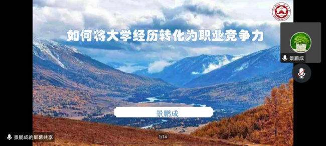 景鹏成,2016年毕业于懂球体育种子科学与工程专业,同年考取石河子大学研究生继续深造,2018年硕士毕业进入新疆大学,从事辅导员工作。报告会上,景鹏成从美丽新疆、如何度过老员工活、职业生涯规划与就业选择三个方面展开,为同学们介绍了大美新疆、新疆人才引进政策,并结合个人经历为同学们剖析了涉农专业当下的就业形势与就业环境,引导同学们在大学期间树立正确的职业价值观与就业观,明晰奋斗目标,鼓励大家“立志做有理想、敢担当、能吃苦、肯奋斗的新时代好青年”。