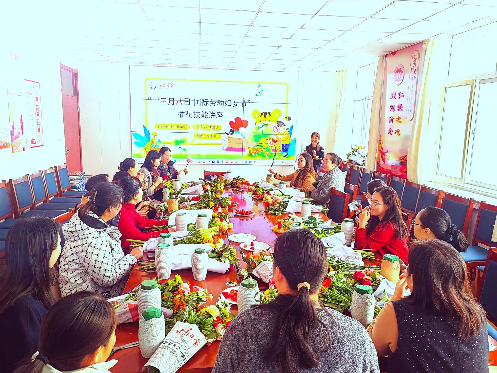 活动伊始,公司负责人向全体女教职工致以节日祝福,充分肯定她们在各项工作中展现的担当与智慧,并寄语大家以“花”为力,以更饱满的热情为教育业贡献巾帼力量。活动中,园艺教研室李翊华教授为大家讲解花语和插花技巧,粉玫瑰的温柔、康乃馨的感恩、小雏菊的生机等将节日的氛围渲染地淋漓尽致,结合实物展示剖析花材特性与色彩搭配法则,系统讲解插花艺术的审美。女老师们指尖轻捻,修枝剪叶、构思造型,将春日的美好和节日的祝福定格在亲手制作的花瓶中。